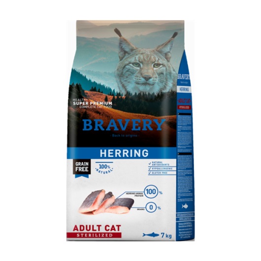 Bravery Herring – Gato Adulto Esterilizado. El arenque (Herring) es un alimento con multitud de beneficios, ya que ayuda a mejorar la piel y el pelo gracias a sus ácidos grasos Omega 3 y 6. Previene y reduce el colesterol gracias a su bajo contenido en grasas saturadas, Además de contribuir al fortalecimiento del sistema inmune y el desarrollo del cerebro.