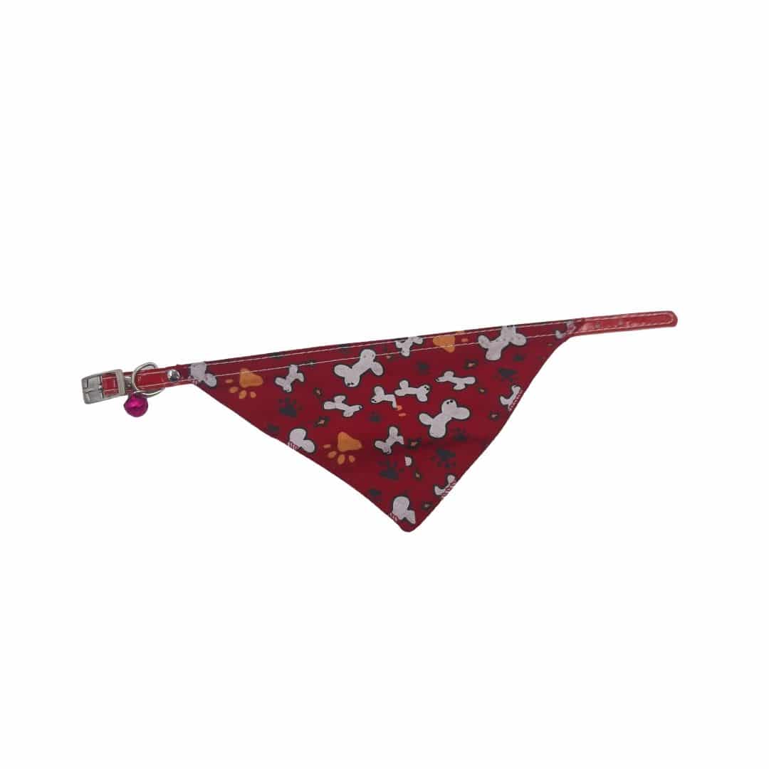 Llamativo collar de banderines, con diseños de huesos y huellas, adornado con un cascabel, con cinco niveles de ajuste. Correa de cuero y banderines en tela.