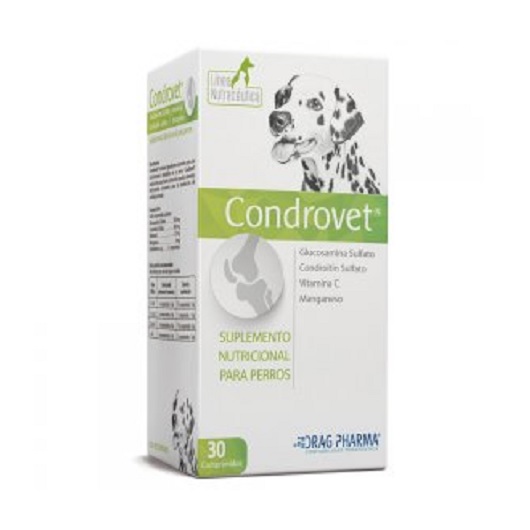 Condrovet 30 comprimidos contiene ingredientes esenciales para unas articulaciones saludables en su perro. Condrovet proporciona una fuente natural de aquellos elementos estructurales necesarios para la mantención del cartílago articular.