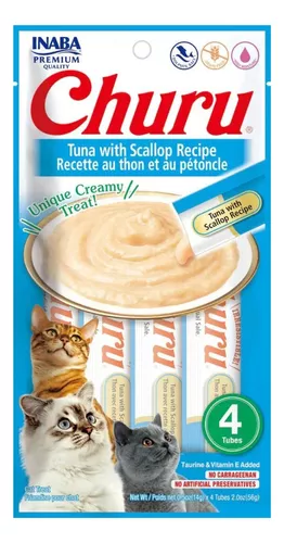 Churu Receta de Vieira: tienen un alto contenido de humedad necesario para la salud de los felinos. Simplemente rasgue un tubo y apriételo un poco para alimentar a mano a su felino con estos snacks sin cereales ni conservantes. También puede verterlo en un plato o añadirlo por encima de alimentos húmedo.