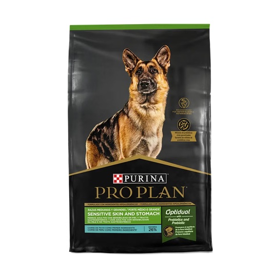 Proplan Sensitive Skin & Stomach Razas Medianas y Grandes ha sido formulado con carne de pavo como primer ingrediente, fuente alternativa de proteína hipoalergénica en perros no expuestos previamente e ideal para perros sensibles. Incluye la tecnología exclusiva Optidual, que combina prebiótico y probióticos vivos garantizados que contribuyen juntos a la salud del sistema digestivo