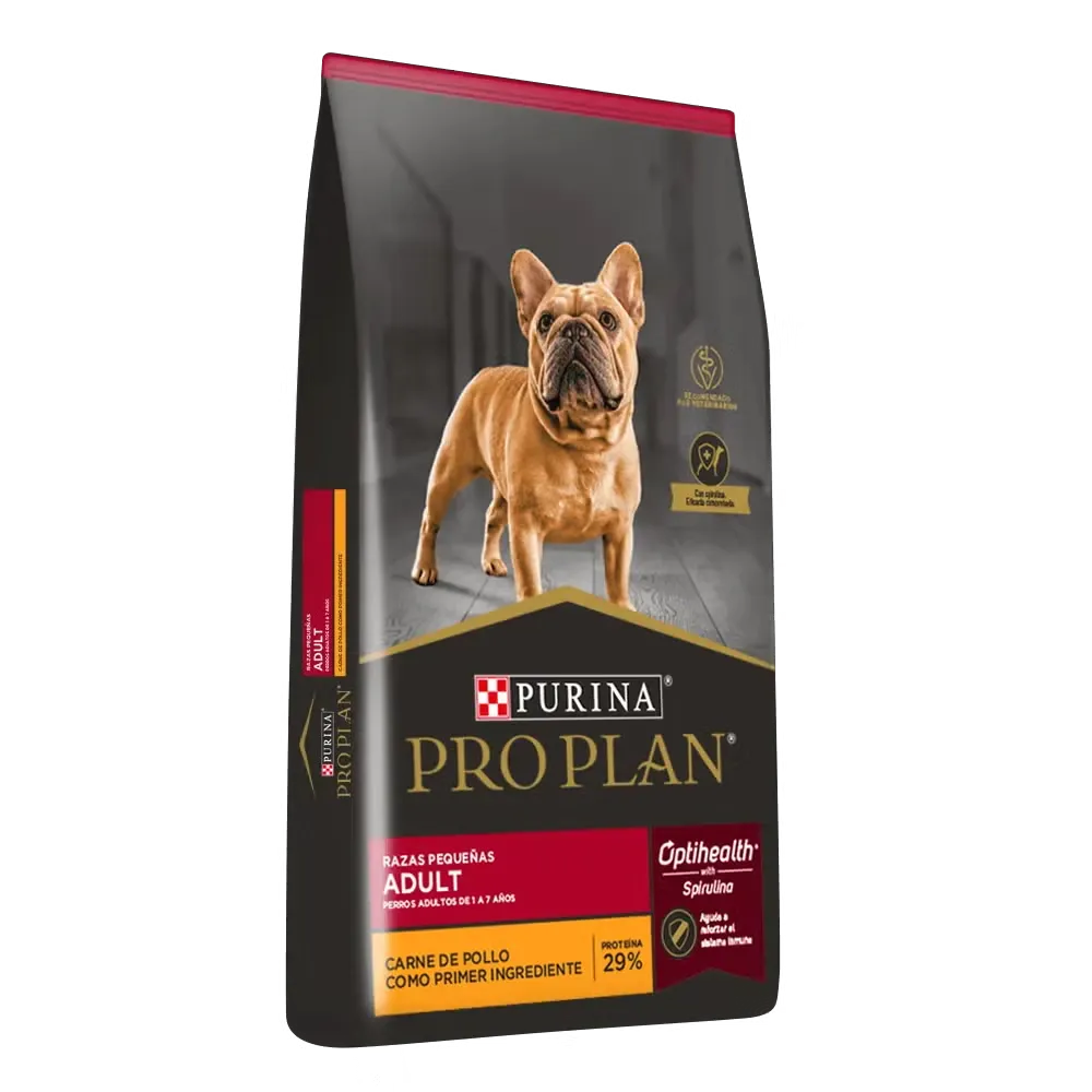 Purina Pro Plan Adulto Razas Pequeñas ofrece una nutrición de vanguardia diseñada para mantener a los perros adultos de razas pequeñas fuertes y llenos de vitalidad. Formulado con carne de pollo como ingrediente principal y enriquecido con la exclusiva tecnología OptiHealth que incluye spirulina, este alimento promueve la salud general y el bienestar de tu mascota.